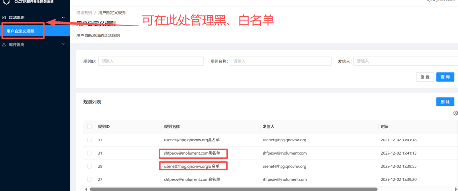 如果误处理了黑、白名单,可以在“邮件网关用户空间”左侧边栏的“过滤规则”→“用户自定义规则”中查看或删除。