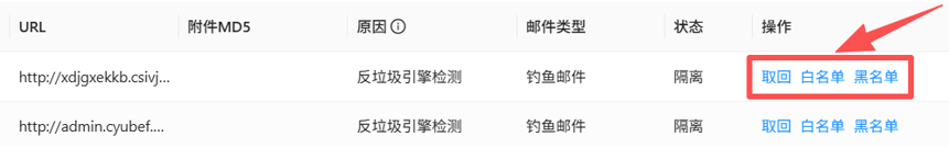 l取回:如果确认某封邮件是正常邮件,可点击“取回”,将其释放至“收件箱”或“垃圾邮件文件夹”。