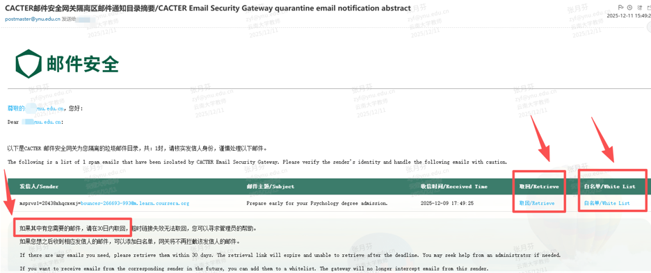 1.定时查收通知邮件:每天上午9:00,网关会向您发送一封隔离区通知邮件,其中会列出过去24小时内被隔离的疑似垃圾邮件目录。您可以直接在邮件中进行操作。